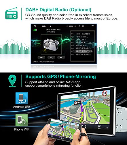 HD Giocare: 1024 * 600 ad alta definizione, supporta 1080p HD video, il supporto per uscita subwoofer, può essere regolato individualmente. Supporta mirror-link, È possibile utilizzare il GPS online del suo smartphone per rispecchiare questa unità, supporta DAB + (opzionale)