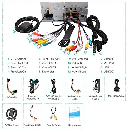 Contenuto della confezione: 1x autoradio, 1x ISO cavo, 1x cavo 3G / USB + Mic, 1x GPS antenna, 1Xmicrofono esterno, 1x Marco, 1x Cam-in cavo, 1x enrada AUX cavo, 1x Mini USB Cavo, 1x uscita audio cavo, 1x manuale dell'utente