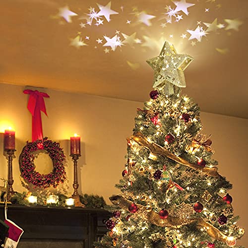 Punta per albero di Natale a forma di stella con proiezione a LED di effetti di luce dinamici, argento scintillante, decorazione per albero di Natale, decorazione per albero di Natale