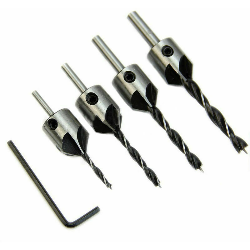 Questo set di punte per trapano svasatore in acciaio viene utilizzato su acciaio, alluminio e altri metalli, plastica o legno. Allargare o svasare fori, sbavare bordi. Un accessorio per punte da trapano ideale per qualsiasi negozio di fabbricazione supportato dalla garanzia a vita del produttore. Caratteristiche: Il quattro pezzi il set include punte per foro pilota per viti da 3 mm, 4 mm, 5 mm, 6 mm. Svasatore in acciaio conico appositamente progettato per foro pilota. Profondità del manico regolabile con una chiave. Punta e svasatura per viti da legno senza cambiare punta. La lunghezza di foratura può essere regolata per viti di diverse lunghezze semplicemente allentando e serrando la vite di fissaggio. Lo smusso è a 5 scanalature, nel processo di utilizzo, può scaricare il legno più velocemente, foro del lavandino monouso forato liscio, tappo per una perfetta vite incorporata nella superficie del pezzo. Testa di perforazione: HSS 4241 con rivestimento in titanio. Acciaio ad alto