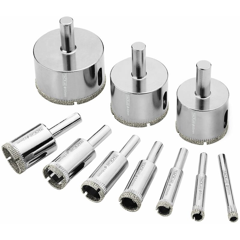 Punta da trapano diamantata da 10 pezzi - Set di punte diamantate 6mm-50mm Caratteristiche: ✔Alta qualità: il materiale di superficie della punta diamantata è il nichel, molto favorevole per prolungare la durata e migliorare la resistenza alla corrosione superficiale. Alta efficienza: la punta da trapano prende il rivestimento diamantato aumentando uniformemente la velocità di perforazione ed è più affilata delle normali punte diamantate. Facile da usare: la combinazione di acciaio al carbonio e rivestimento con trapano diamantato è favorevole per installare punte da trapano con forza nel trapano Eccellente attrezzatura: design con apertura laterale, potrebbe rimuovere facilmente i residui per mantenere la punta pulita;