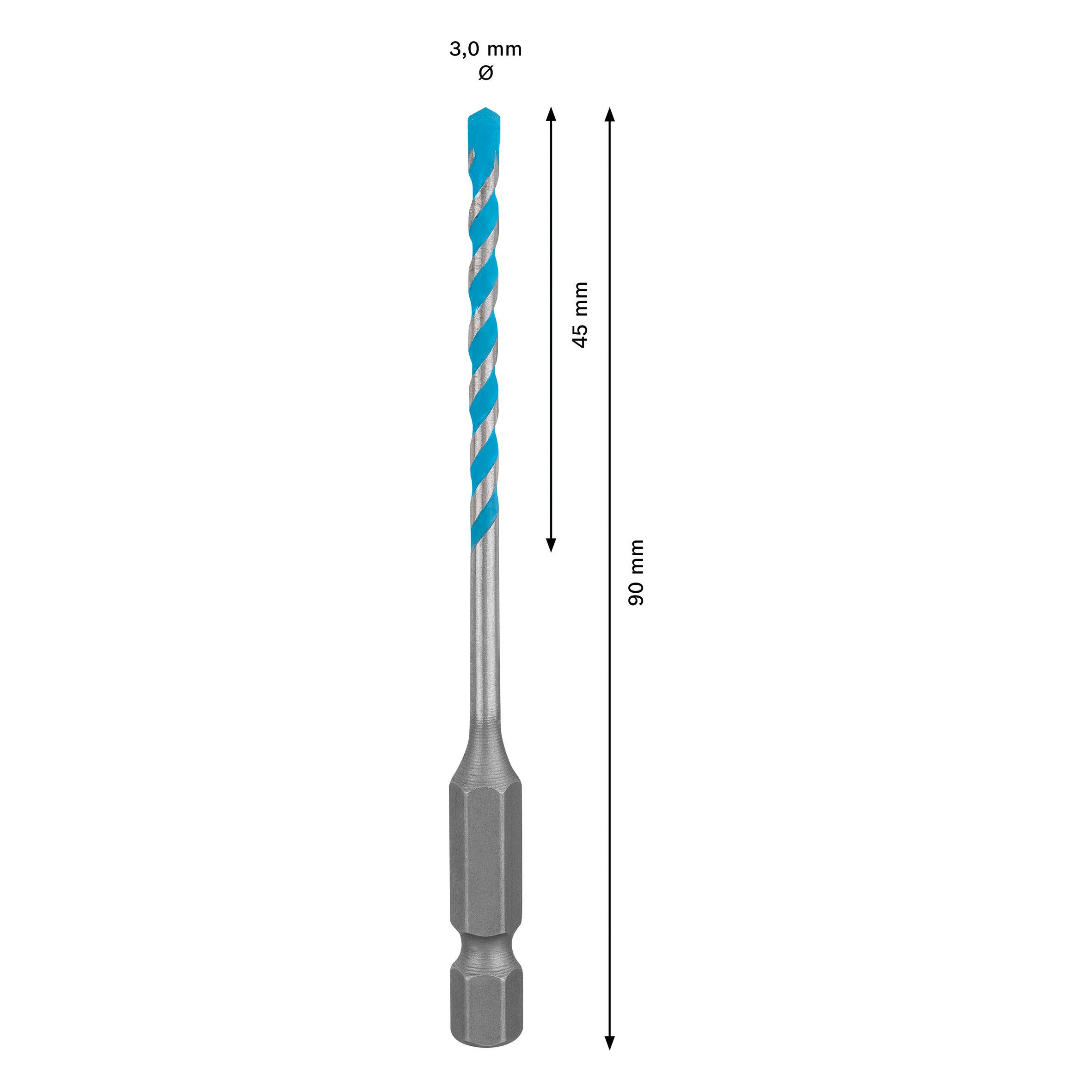 Bosch Professional 1x Punte Expert HEX-9 MultiConstruction per Calcestruzzo, Ø 3.00x90 mm, Accessorio Trapano a Percussione. Adatto per praticare fori in materiali multipli, può essere utilizzata nella modalità a percussione su calcestruzzo e pietra nonché in modalità rotativa per mattoni, piastrelle, lamiera, legno e plastica. Una foratura precisa resa semplice grazie alla tecnologia brevettata Bosch Centering Geometry