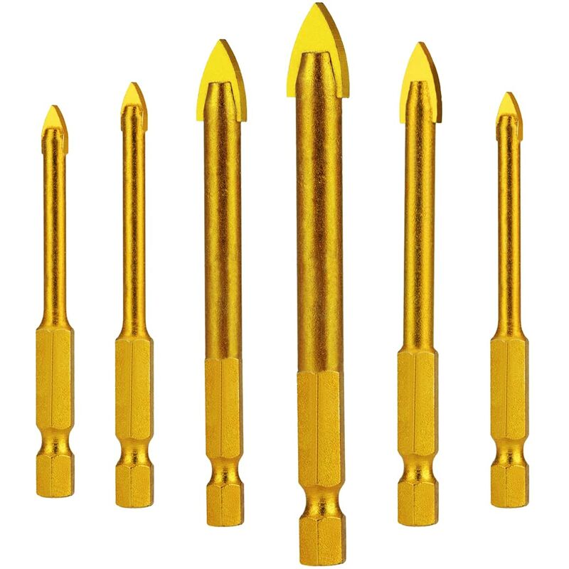 Punte da trapano per piastrelle in vetro o ceramica da 6 pezzi con gambo esagonale, diametri della punta: 3/4/5/6/8/10 mm. Il diametro del gambo esagonale è di 6,35 mm (1/4), è compatibile con la maggior parte delle punte. Specificamente progettati per perforare materiali con superfici dure e fragili, hanno un perforazione precisa, senza deteriorare il materiale.Le punte sono in acciaio al tungsteno, affilate e resistenti all'usura, le loro superfici sono rivestite di Titanio, antiossidante che non scolorisce. È facile e veloce perforare il materiale, inoltre c'è un taglio liscio senza sbavature.Colore: Peso d'oro: 30gTaglia: 6,5 x 3 x 0,65 cm.