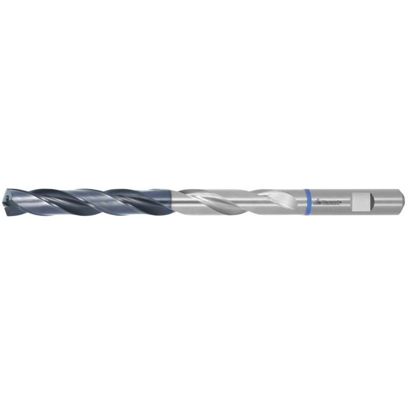 Nocciolo robusto e punta speciale, tagliente trasversale con elevata precisione di centratura. Precisione di allineamento particolarmente elevata grazie ai 4 biselli che stabilizzano la punta anche in forature profonde. I taglienti principali diritti, con spigoli arrotondati, e la forma delle scanalature producono trucioli corti, anche con materiali che solitamente producono trucioli lunghi. Vantaggi: Elevata sicurezza di lavorazione e grande qualità della finitura superficiale del foro. Nota: Lunghezza scanalatura per trucioli LC = L2 + 1,5 × DC. Dati tecnici Colore collarino blu Angolo di affilatura Grad 135 Passaggio interno per LR sì, con 25 bar Materiale da taglio HMI Rivestimento TiAlN Strategia di truciolatura HPC Esecuzione 10×D Codolo DIN 6535 HB con h6 INOX > 900 N/mm² m/min idoneo INOX < 900 N/mm² m/min idoneo a umido max. idoneo Uni m/min limitatamente adatto Acciaio < 750 N/mm² m/min idoneo Alluminio > 10% Si m/min limitatamente adatto a umido min. idoneo Acciaio < 500