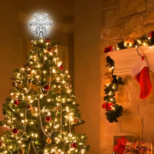 Bee Elf Puntale Albero Natale Luminoso con Luci LED Rotanti 3D, Stella Superiore dell'Albero Natale Fiocco di Neve Rotante con Proiettore,Ornamenti Decorazioni per Casa,Compleanno,Matrimonio-Argento