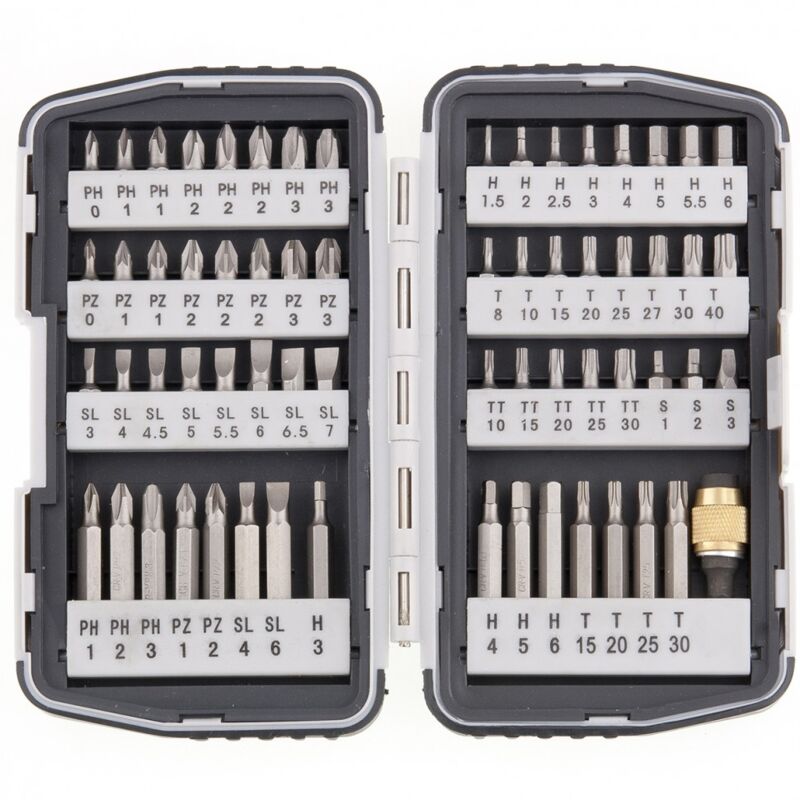Una scatola ben fornita La scatola MTX contiene 63 inserti di diversi tipi (a croce, Torx, piatti, esagonali, ecc.). Possono essere utilizzati con cacciaviti o trapani e altri strumenti compatibili. È incluso anche un adattatore magnetico. Tra le 64 pezzi di questa scatola, ci sono 15 punte da 50 mm, per accedere a viti potenzialmente difficili da raggiungere. Il tutto viene consegnato in una scatola per facilitarne la conservazione e il trasporto.