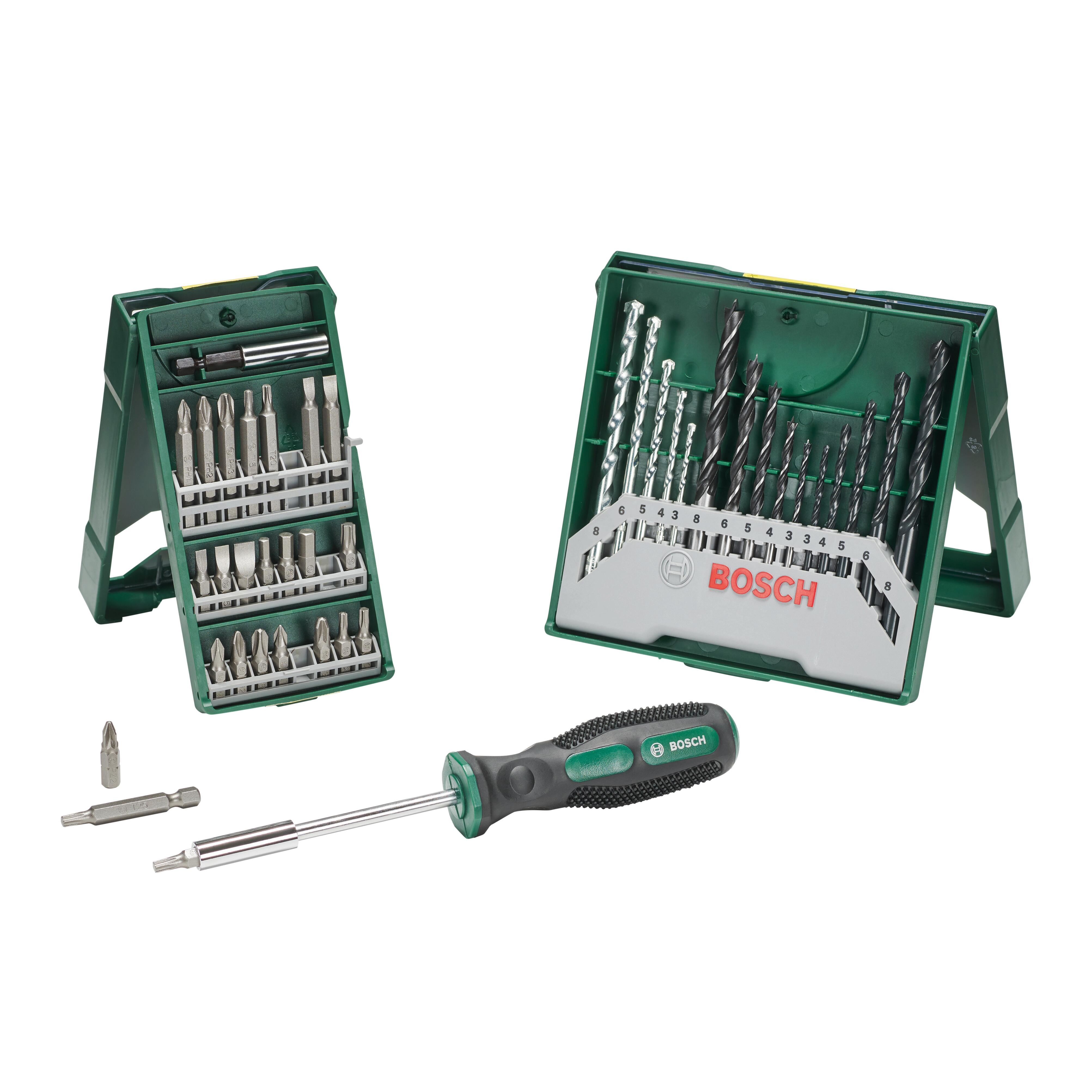 Due X-Line Set con punte per cacciavite e punte elicoidali e un utile cacciavite manuale Bosch. Per ogni applicazione di avvitamento e foratura. Il set misto foratura da 15 pezzi Mini-X-Line è ideale per forare muratura, legno e metallo. Il set misto di punte per avvitamento Mini X-Line da 25 pezzi è ideale per avvitare sia con cacciavite manuale (incluso) sia con avvitatore elettrico.. Avvitamento, foratura.. Prodotto versatile utile per soddisfare molteplici esigenze di avvitamento e foratura nella vita quotidiana.