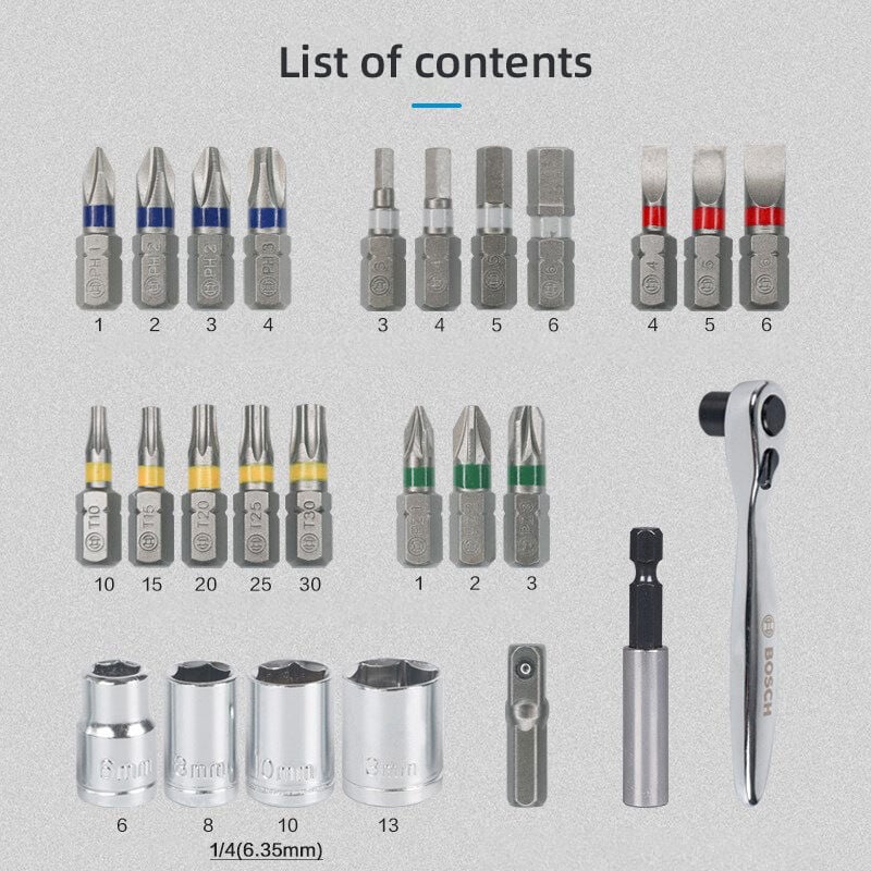 Peso: 0,3 kg Dimensioni: 12,1 x 9 x 3,2 cm Colore: come nella foto Set di punte per cacciavite e cricchetto con punte per cacciavite codificate a colori adatte a tutti i comuni lavori di avvitatura e assemblaggio Compatibilità Adatto a tutte le marche di utensili elettrici e cacciaviti a mano Cacciavite e punta a cricchetto da 26 pezzi set Set di punte per cacciavite di alta qualità codificate a colori, chiavi a bussola standard e cricchetto per vari lavori di avvitamento e montaggio. Punte per cacciavite durevoli per 5 tipi di teste di viti in 20 dimensioni comuni. Suggerimenti con codice colore per una rapida panoramica e un accesso più rapido alla vestibilità. Cambio utensile rapido e buona tenuta della vite nella punta grazie al supporto universale magnetico a cambio rapido. Cricchetto compatto per un facile fissaggio senza bisogno di utensili elettrici Comodo riposto nella pratica scatola di immagazzinaggio