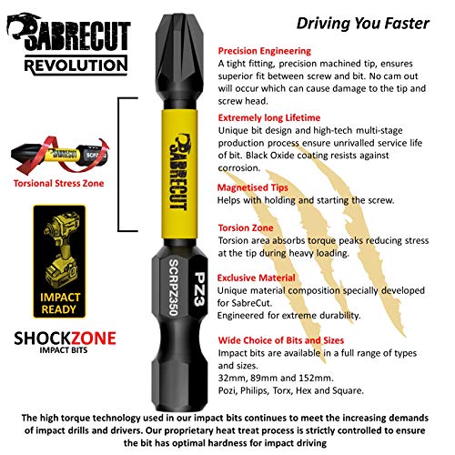 Punte per cacciavite PoziDriv (PZ3) di qualità professionale SabreCut Revolution appositamente progettate per l'uso con avvitatori a impatto, le punte hanno una punta forgiata per una maggiore resistenza agli urti e una maggiore durata