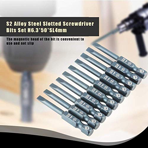 Set di 10 punte per cacciavite a taglio da 50 mm, testa piatta magnetica, gambo esagonale da 1/4", in lega di acciaio S2, H6,3 x 50 x SL4 mm.
