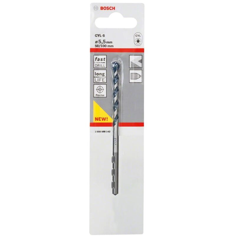 BOSCH - PUNTE PER CALCESTRUZZO CYL-5 DIAMETRO 5,50MM Punta ad elevate prestazioni con due taglienti diamantati e un design a 2 spirali per una buona asportazione della polvere e una foratura più rapida Power-Grip-System per trasferire la potenza dall'utensile alla punta Punta a prova di martello secondo ISO 5468 con punta di centraggio attiva activeteq per il taglio attivo nel calcestruzzo In metallo duro con dimensioni grana fini per una durata lunga e la migliore resistenza Compatibilità: Utilizzabili con tutti i trapani a percussione Punta da calcestruzzo per la lavorazione professionale di calcestruzzo, pietra arenaria calcarea, pietra naturale e pietra artificiale