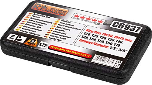 Set di punte TORX (30, 75 mm) - Set di chiavi a bussola 22 pezzi (T20 T25 T30 T35 T40 T45 T50 T55 T60 T70) + 2 accoppiatori 1/2" & 3/8" pollici - Set di punte a stella (HRC 58-62) - Acciaio S2 Cr-V