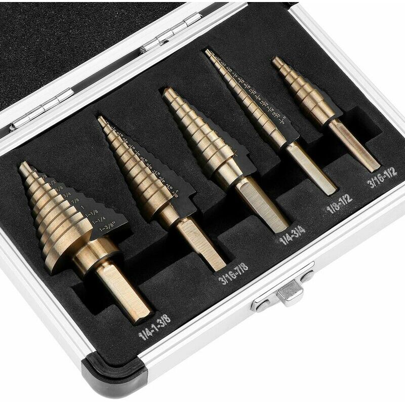 Pratico e preciso - : praticare fori di diverse dimensioni senza cambiare punte. Con queste punte per trapano a gradini, puoi praticare fori di diversi diametri, risparmiando molti problemi. Ottimo per lamiere in acciaio, lamiere in alluminio, rame, plastica, legno e molti altri tipi di metalli, e fresatura. Ideale per l'uso domestico e in generale nell'edilizia/ingegneria. 【Foratura pulita e precisa】: aperture di tipo X per una facile rimozione dei residui di taglio durante la perforazione, impedendo la dispersione di trucioli di ferro o segatura per garantire pulizia e foratura precisa. 【Design】: sbavatura automatica dei fori durante la foratura. La punta da trapano grande ha un codolo a 3 lati e le punte da trapano piccole hanno un codolo esagonale per evitare scivolamenti nel mandrino. Queste punte da trapano sostituiscono 50 punte da trapano singole. Il design a due scanalature consente un taglio più rapido e uniforme. Il gambo a tre lati (Tri-Flat) non scivola nel mandrino del