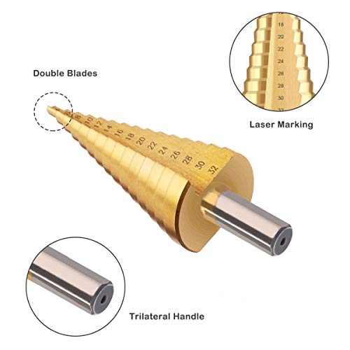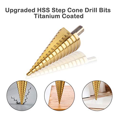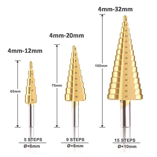 【Includi 3 dimensioni passo】: 3 set PC Punte trapano a cono passo HSS rivestite in titanio (4-12 mm, 4-20 mm e 4-32 mm). Fornito con un sacchetto di cotone.