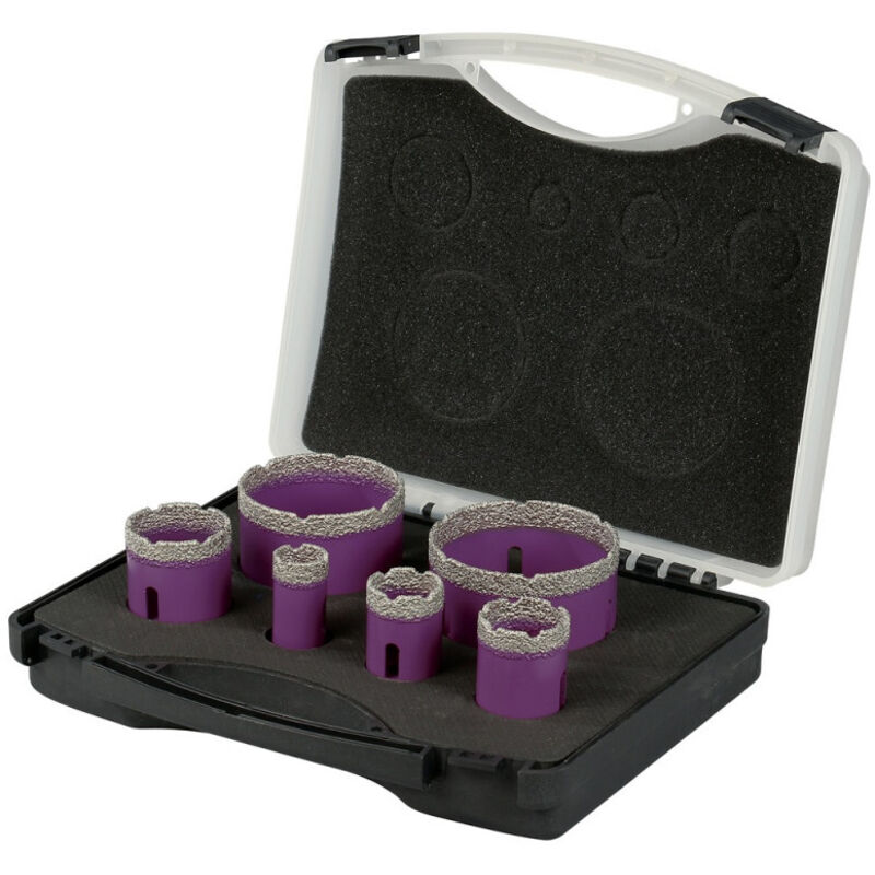 Dettagli: Punta diamantata a testa scanalata Foratura a secco, orizzontale o verticale Testa completamente diamantata con tecnologia di brasatura a vuoto Con foro M14 per il montaggio su smerigliatrice Adattatore esagonale opzionale per foratrice codice 11101447 Ottima velocità di foratura e finitura eccellente in materiali decorativi come ceramica, gres, terracotta, materiali compositi, fibra di vetro, marmo, granito Fori di estrazione del nucleo Caratteristiche: Formato: Scatola Per macchina: Smerigliatrice Diametro (mm): 22 - 30 - 35 - 42 - 68 - 76 Modello di connessione: M14 Lunghezza utile (mm): 35 Velocità massima (giri/min): 12 200 Altezza del segmento (mm): 10 Spessore del segmento (mm): 2,5