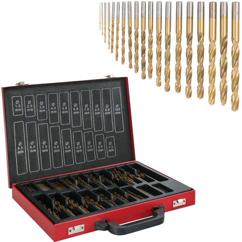 ROBUSTO - La lega di acciaio per utensili HSS è caratterizzata da grande durezza, resistenza al rinvenimento e resistenza al calore. [RESISTENTE AL CALORE] Il rivestimento in nitruro di titanio offre una resistenza all'usura ancora maggiore, nonché una resistenza alla corrosione. [AREA DI APPLICAZIONE] Adatto a vari acciai e metalli, ghisa, plastica e legno. [PRATICO] Superficie trattata a vapore | Laminati a rullo tipo N, cilindrici, di testa corta, taglio destrorso | Cono alleggerito a 118°. [CUSTODIA PER IL TRASPORTO] Comoda maniglia per un facile trasporto | Inserto integrato per lo stoccaggio compatto degli attrezzi | Informazioni sulle dimensioni chiaramente leggibili nella custodia. Set di punte elicoidali in titanio 170pz HSS di AREBOS ‒ la soluzione giusta per ogni esigenza Il set di punte da trapano per metallo AREBOS è eccellente per l'uso nell' industria, artigianato e officine . Le punte elicoidali sono adatte per la foratura di materiali con una durezza fino a ca.