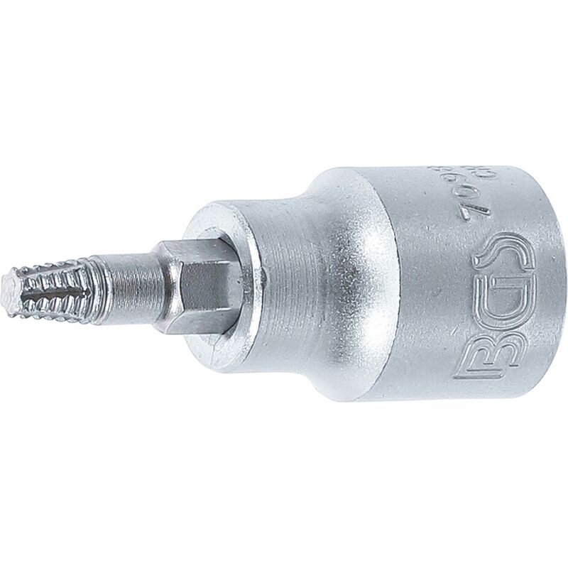 Per la rimozione di viti con profilo a T difettose (per Torx) consente l'allentamento sicuro di viti il cui profilo di guida è danneggiato o inutilizzabile filettatura speciale per taglienti conici con rotazione sinistra Per funzionamento manuale Su binario metallico Peso lordo: 38 g Profilo dell'unità: presa quadrata Dimensione del profilo dell'unità, pollici: 3/8'' Trattamento superficiale: cromo, opaco Dimensione profilo guida, in m: 10 mm Dimensioni del profilo di spinta: T25 Materiale: acciaio al cromo vanadio (S2)