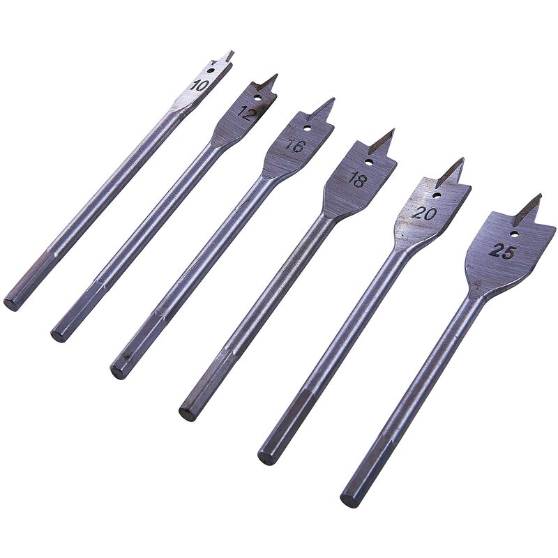 Set di punte piatte da legno. Prodotto da Am-Tech. Confezione da 6 pezzi. Misure: 10 mm. 12 mm. 16 mm. 18 mm. 20 mm. 25 mm. Taglio di precisione su tutte le superfici, per forare legno in modo accurato. Possono essere utilizzate con la maggior parte dei trapani. Gambo esagonale.
