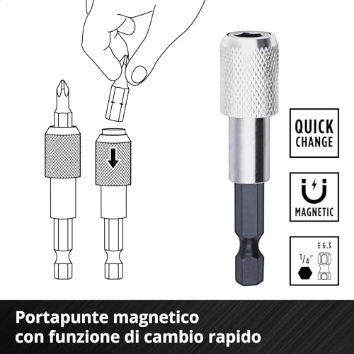 Portapunte a cambio rapido - Per un cambio rapido e semplice delle punte, il portapunte a cambio rapido lungo 60 mm in acciaio al carbonio completa il set di punte e trapani Einhell.