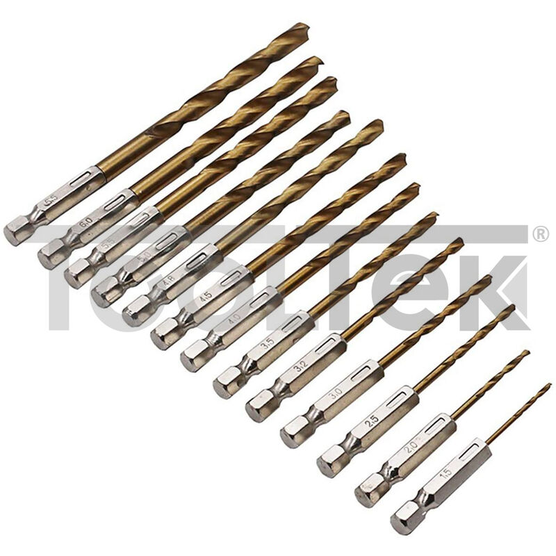 Set punte per trapano avvitatore 13 pezzi. Ideale per tutti gli avvitatori a batteria le punte hanno un fusto esagonale Possono essere facilmente inserite nella lama esagonale della chiave a batteria o del portapunte a cambio rapido.Con le punte HSS in acciaio ad alte prestazioni si possono forare facilmente diversi materiali di metallo e plastica.Il rivestimento in titanio di alta qualità garantisce una perforazione rapida ed una durata particolarmente lunga. CARATTERISTICHE: Materiale: titanio HSS rivestito con nitruro di titanio.Dimensione della punta: 1,5 mm, 2 mm, 2,5 mm, 3 mm, 3,2 mm, 3,5 mm, 4 mm, 4,5 mm, 4,8 mm, 5 mm, 5,5 mm, 6 mm, 6,5 mm. Rivestimento in nitruro di titanio facilita più penetrazione con meno sforzo.Gambo: 1/4 esagonale. Prodotto di qualità.