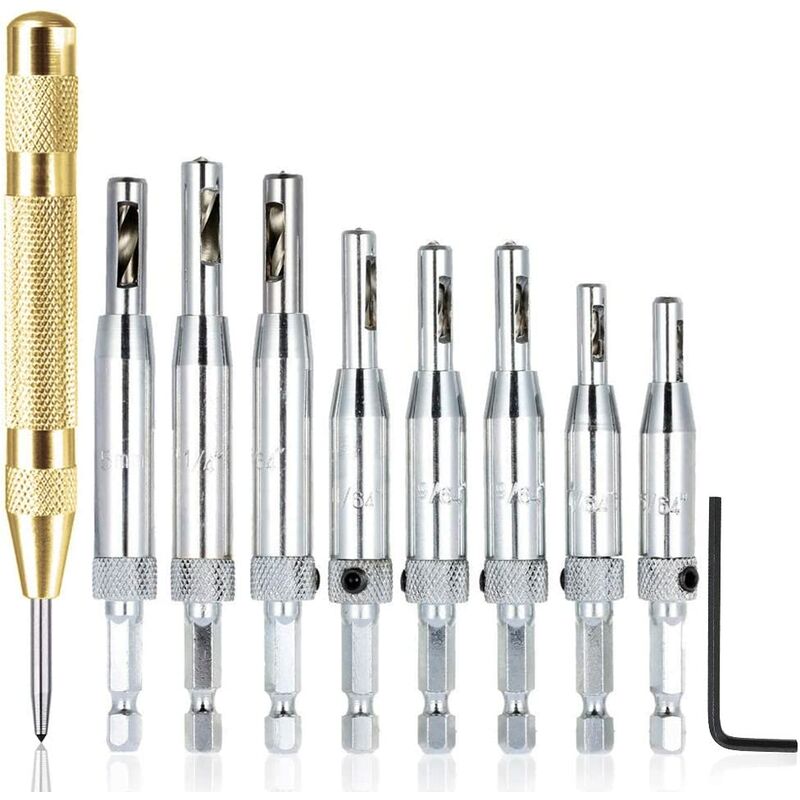 POSIZIONAMENTO PRECISO: Nessun movimento, la segatura si scaricherà automaticamente dalla parte superiore del foro su entrambi i lati, la punta del trapano non verrà bloccata. 7 DIVERSE DIMENSIONI: Vieni con le dimensioni delle viti della cerniera più comuni 5/64, 7/64, 9/64, 11/64, 13/64, 5 mm, 1/4. BONUS: dotato di punzone centrale automatico. Segna il pezzo con una fossetta, creando un punto di partenza che impedisce la perdita di viti e punte da trapano. FACILE DA SOSTITUIRE: legno di durezza diversa, necessita di una punta centrale diversa, basta smontare la vite e sostituire la punta . FACILE DA INSTALLARE: Design unico e perfetto effetto d'impatto. Applicabile per l'installazione della cerniera della porta. Punte a cambio rapido facili da usare e da installare che si caricano e si rilasciano con una sola mano.