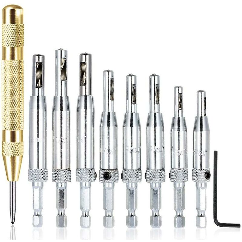 POSIZIONAMENTO PRECISO: Nessuno spostamento, la segatura si scaricherà automaticamente dalla parte superiore del foro su entrambi i lati, la punta del trapano non verrà bloccata. 7 DIVERSE DIMENSIONI: Vieni con le più comuni dimensioni delle viti per cerniere 5/64, 7/64, 9/64, 11/64, 13/64, 5 mm, 1/4. BONUS: vieni con un punzone centrale automatico. Segnare la parte con una fossetta, creando un punto di partenza che impedisca la perdita di viti e punte da trapano. FACILE DA SOSTITUIRE: legno di durezza diversa, necessita di un trapano di centraggio diverso, basta smontare la vite e sostituire il trapano. FACILE DA INSTALLARE: design unico e perfetto effetto sorprendente. Applicabile per l'installazione della cerniera della porta. Punte a cambio rapido facili da usare e da installare che si caricano e si rilasciano con una sola mano.