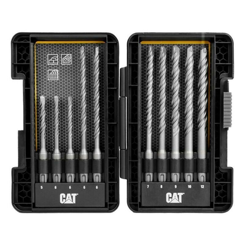 Set di punte da muro elicoidali SDS Plus. Possono essere utilizzate sia per i prodotti a marchio CAT, ma anche per altri brand che trattano elettroutensili. Nel set gli accessori con le seguenti caratteristiche: 3 x 110 mm (Ø5 mm, 6 mm, 6 mm), 7 x 160 mm (Ø6 mm, 7 mm, 8 mm, 9 mm, 10 mm, 12 mm). Tutte le punte sono in carburo di tungsteno con 4 taglienti e il gambo in acciaio al cromo vanadio temprato. La forma a U favorisce la rimozione della polvere tramite i canali presente nel corpo. Tutte le punte sono state pensate e create per ridurre il rischio che il corpo si pieghi o si rompa, garantendo una perforazione costante. Facili da trasportare grazie all'utile scatola.