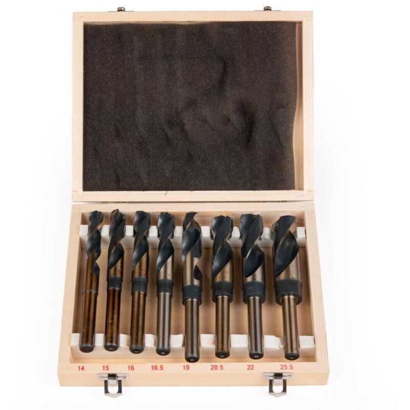 SET DI PUNTE PER TRAPANO ELICOIDALI CON GAMBO 13mm. IL KIT SI COMPONE DI 8 PUNTE ELICOIDALI PER FERRO REALIZZATE IN ACCIAIO HSS DI ALTISSIMA QUALITA' UTILIZZABILI CON QUALSIASI TIPO DI TRAPANO CON MANDRINO DA 13mm. MISURE: 14--15--16--16,5--19--20,5--22--25,5mm IL TUTTO IN PRATICA VALIGETTA DI LEGNO.