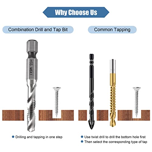 【Ampia Applicazione】 - Questo set di punte per maschiatura ha un design unico, allo stesso tempo foratura, maschiatura e smussatura. Ampiamente usato nel fai da te domestico, nei ricambi auto, nella lavorazione del legno, nella riparazione di macchine professionali, ecc.