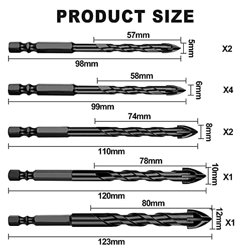LA CONFEZIONE INCLUDE: 10 pezzi di punte per trapano per muratura, 2X 3/16" (5 mm), 4X 1/4" (6 mm), 2X 5/16" (8 mm), 1X3/8" (10 mm) e 1X 1/2 " (12mm) Per soddisfare le diverse esigenze.