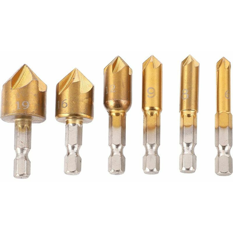 DESIGN SCANALATO A 5 LAMA - Il design scanalato a cinque lame elimina le vibrazioni e le vibrazioni per una migliore rimozione dei trucioli e un funzionamento regolare per eseguire tagli puliti, precisi e senza sbavature che non sono facili da opacizzare. < li> 6 DIVERSE DIMENSIONI: 6 punte svasate di diverse dimensioni: 6 mm/0,2 pollici, 8 mm/0,3 pollici, 9 mm/0,4 pollici, 12 mm/0,5 pollici., 16 mm/0,6 pollici, 19 mm/0,7 pollici, per soddisfare le vostre diverse esigenze. IDRAL PER LA FORATURA DEL LEGNO: questa punta svasata viene utilizzata principalmente per aprire fori e smussare pannelli a bassa durezza come pannelli in legno e plastica.< /li> RIVESTIMENTO ANTIRUGGINE: La superficie placcata della punta del trapano è inossidabile, quindi è più bella e ha un'elevata durezza superficiale. CON ATTACCO ESAGONALE DA 1/4 POLLICE: Con attacco standard Gambo esagonale da 1/4 di pollice, la punta è adatta a molti trapani, inclusi trapani a mano, trapani a batteria, ecc.