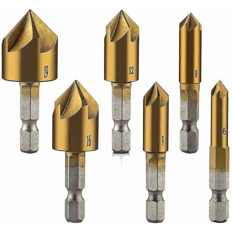 Svasatore rivestito in titanio. Durevole e lunga durata. Tutte le punte hanno un angolo della punta di 90 gradi compatibile con svasature affilate e precise. Il tagliente è temprato e levigato per la nitidezza. .Cinque flauti design. Un tagliente a cinque scanalature senza vibrazioni con denti di taglio sfalsati disposti in modo da consentire il libero flusso dei trucioli e un taglio rapido e senza vibrazioni. Il codolo esagonale da 1/4" si adatta alla maggior parte degli utensili elettrici. Applicazioni multiple. Eccellente compatibilità con l'apertura del legno, l'alesatura, la smussatura, la testa della vite e così via. Adatto compatibile con assi di legno, compensato, lastra di alluminio, fibra di legno, truciolare, plastica, pannelli in PVC e altri vari materiali morbidi smussati. Il punto di autoavviamento e il design a cinque punti eliminano vibrazioni e chiacchiere compatibili con un funzionamento regolare per eseguire tagli puliti, precisi e senza sbavature in condizioni di