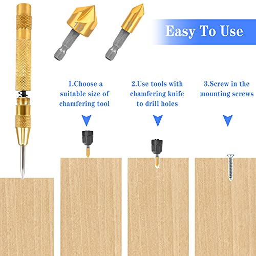 Abbinamento Perfetto: La punta del trapano svasatore con due punzoni automatici. È possibile utilizzare lo strumento per praticare un piccolo foro nel pezzo in lavorazione prima di perforare per evitare che la vite e la punta del trapano si spostino. Il punzone centrale automatico viene punzonato dalla forza d'urto generata dalla molla interna, ciò consente di completare il lavoro più facilmente.