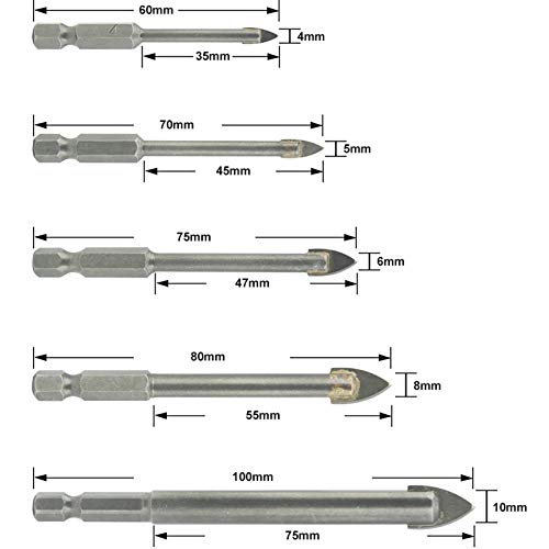 Set di punte per trapano in vetro da 5 pezzi con attacco esagonale a punta rapida in metallo duro 4 5 6 8 10 mm in una custodia di plastica