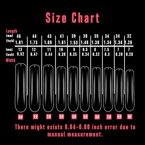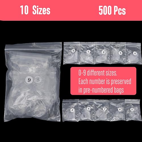 Diverse opzioni di misura: queste punte hanno 10 diverse dimensioni per le dita selezionate in ogni mano, in base alle unghie degli utenti. Ogni punta dell'unghia ha un numero di riferimento sulla punta in modo da poterla distinguere e riservare facilmente.