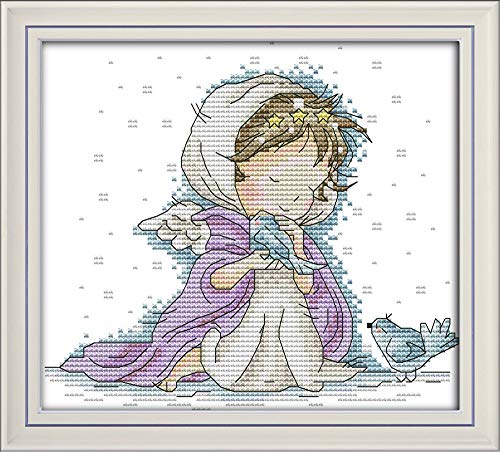 Kit per punto croce, motivo: angelo con due uccellini, con ricamo a punto croce, accessori stampati o contati, per adulti, principianti, regali per bambini (angelo, stampato)