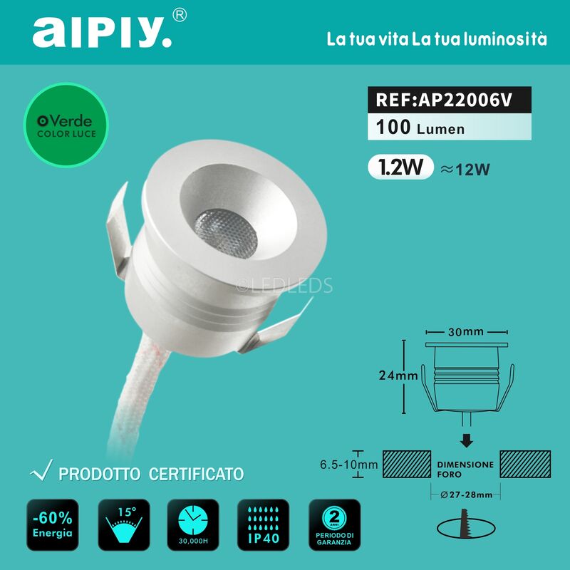 Consumo Energetico 1.2 Watt Led: 1 Led Da 1.2 Watt, Tipo Di Led Power Temperatura Luce:verde Flusso Luminoso: 108 Lumen Alimentazione: 220v Foro Incasso: 2.7 Cm Diametro Esterno: 3cm Altezza Totale: 2.4cm Angolo Luce: 15° Colore Faretto: Acciaio Satinato Il Prodotto E' Venduto Completo Di Tutte Le Componenti Necessarie Per Una
