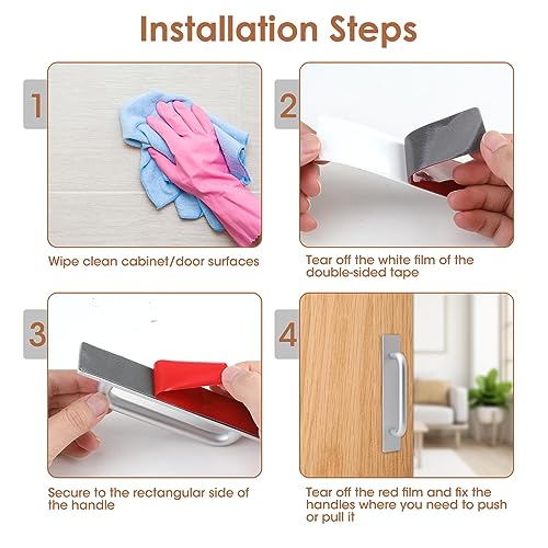 【FACILE DA INSTALLARE】 Le maniglie delle porte sono dotate di un robusto nastro biadesivo antitraccia, durante l'installazione, basta staccare la pellicola protettiva dal retro adesivo e incollarla sul mobile. (Nota: non tirare per gravità e posizionare oggetti pesanti entro 24 ore.) Se in futuro si desidera sostituire la maniglia dell'armadio, è sufficiente utilizzare un asciugacapelli per preriscaldare e la colla cadrà.