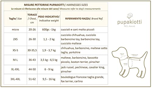 PRATICITÀ: Facile da mettere e indossare. Si mette e si toglie in pochi secondi, aprendo una sola fibbia. La pettorina è regolabile e la si può, quindi, indossare sopra o sotto i cappottini. Adatta ai cani di tutte le razze da 0,8 kg a 16 kg. La pettorina è costituita da un corpo ergonomico a forma "bustier" in pelle, al quale si collega il cinturino per una corretta e pratica regolazione. Il cinturino è in pelle doppio strato con cuciture rinforzate e anello saldato, per maggior comfort.