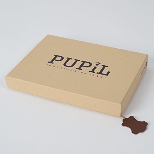 Presentato in una confezione regalo di carta, accuratamente avvolto in carta velina e rifinito, un cartellino con il logo PUPiL in vero cuoio goffrato legato alla custodia