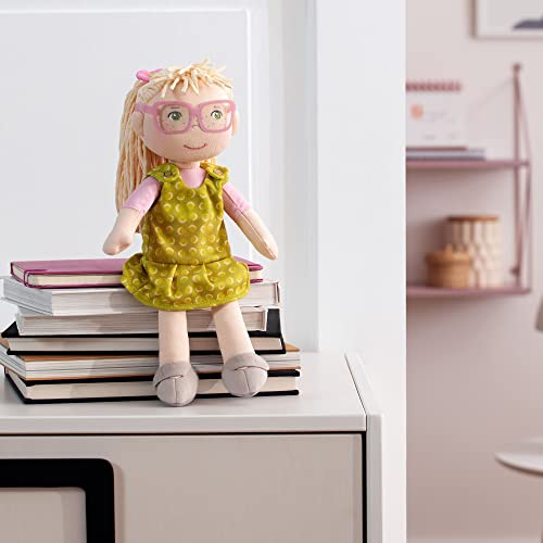 La bambola di stoffa HABA è alta 30 cm, indossa un abito verde con bottoni a pressione, lunghi capelli biondi e occhiali rimovibili. Il viso è ricamato.