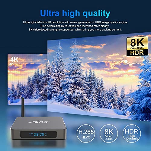 [3D 8K H.265 Android TV Box] La scatola TV Android supporta la risoluzione Ultra HD 8K e i filmati 3D, con profilo multimediale HDR10 professionale e tecnologia di decodifica video H.265, rende ogni dettaglio dello schermo è lucido, p