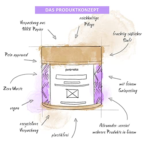 Puremetics Gel doccia 3 in 1 (250 g) | Gel doccia, peeling e lozione in un unico | vegano e privo di plastica | nutriente, delicato sulla pelle e leviga | senza microplastica | Peeling di zucchero e sale marino | Zero Waste