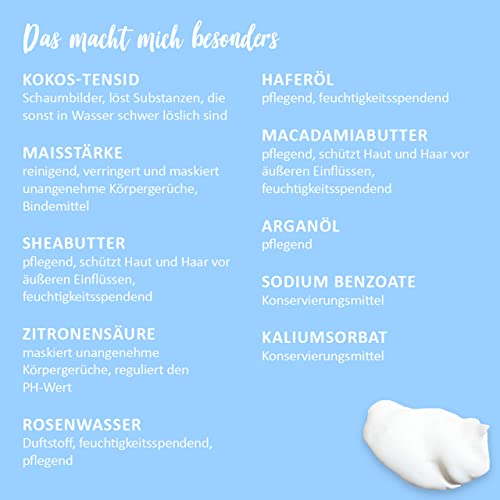 SCHIUMA PARTY: per questo utilizziamo un tensioattivo vegetale di cocco, che è molto più delicato, sicuro, ecologico e delicato sulla pelle rispetto al diffuso SLS chimico. Schiuma party? Ma ovviamente, per favore! A ciò si aggiungono oli vegetali ed essenziali di alta qualità.