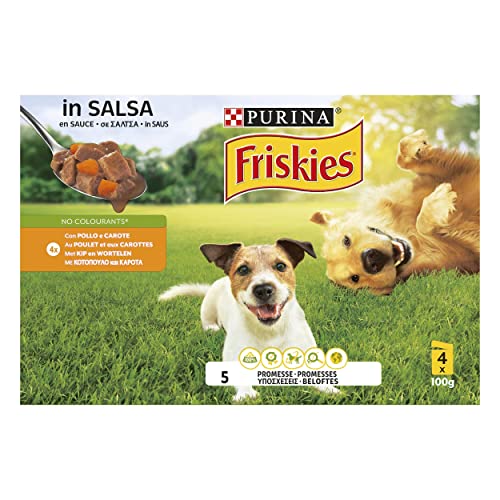 Il cibo umido per cani Friskies è un Alimento Completo in salsa per cani adulti con Pollo e Carote