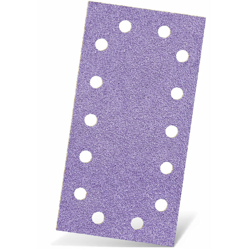 Carte abrasive velcrate MENZER, G60 Informazioni sul Prodotto Autoaffilante Riduzione dell'intasamento grazie al rivestimento antiaderente Risultato di levigatura omogeneo Asportazione di materiale elevata e costante Lunga durata di utilizzo Dati tecnici Supporto: Carta al lattice Dimensioni: 230 x 115 mm Tipo di abrasivo: Fogli abrasivi Attacco: Sistema a strappo Grana classificazione: Grossolana Foratura: 14 fori Tipo di grana: Miscela di ceramica Applicazione Legno: 8/10 Gesso, stucco: 10/10 Plastica: 10/10 Colore, vernice: 10/10 Legenda: 10 - molto adatto, 0 - non adatto Descrizione del Prodotto MENZER Purple HD - Abrasivo ceramico ad alte prestazioni per le opere di finitura interna Purple HD MENZER è un abrasivo ceramico ad alte prestazioni sviluppato per soddisfare i requisiti più elevati nelle opere di finitura interna. Il mix di granuli ceramici autoaffilanti e corindone semi-friabile garantisce un'eccellente qualità della superficie ed elevate prestazioni di asportazione.