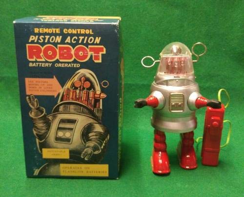 Questo robot a batteria ha 3 pistoni nel suo casco che scivolano su e giù quando avviato. La sua antenna gira e cammina in avanti. Dispone anche di bracci regolabili. Altezza: 215 mm.