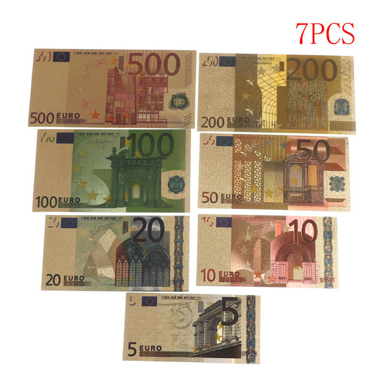 Caratteristiche:1. UN insieme di Euro: 5 EUR, 10 EUR, 20 EUR, 50 EUR trasporto di 100 Euro, 200 EUR.500 EUR2.Ideal per la raccolta.3.Material:PET + 24K lamina d'oro4.Type: Multicolore di stampa5.Purpose: collection & apprezzamento6. Nessun valore in uso.Cornici E Articoli Da Esposizione incluso:7X Commemorative Banconote (Euro).