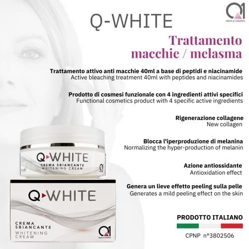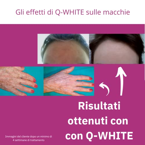 RISULTATI IN SOLE 4 SETTIMANE: Efficace sulle macchie della pelle dovute ad iperpigmentazione, ipercromia e melasma: il trattamento produce produce un risultato visibile in 4 settimane di utilizzo (tempo di ciclo di sostituzione delle cellule). Q-White è utile anche d'estate per prevenire la comparsa di macchie solari