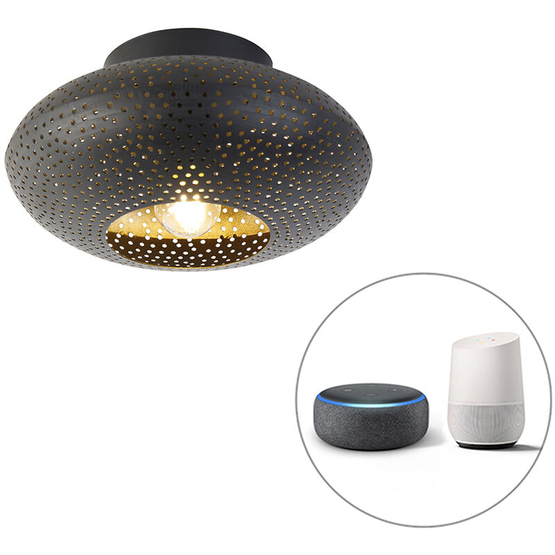 QAZQA Plafoniera intelligente nera con oro 25 cm incluso Wifi A60 - Radiance La lampada da soffitto Radiance è una vera attrazione per un interno orientale! La plafoniera è nera e realizzata in acciaio. La lampada ha un diametro di 25 cm e un'altezza di 15 cm. Grazie all'elevata potenza luminosa fino a 806 lumen, la plafoniera è adatta per l'illuminazione funzionale. Non sei a casa da un po'? Quindi Radiance può essere controllato da remoto con il tuo smartphone o sistema di casa intelligente. Che vincente Radiance è. Sempre la giusta atmosfera a casa con questa plafoniera. Portalampada: E27 . Max 1 x 4.5 W, 230 V Adatto a: LED Voltaggio: 220V/230V IP Classe di protezione: [IP20] A prova di polvere Funzioni extra: Regolabile: Dimmer incluso,No, senza cavo e spina Lampadine inclusiva Il QAZQA Plafoniera intelligente nera con oro 25 cm incluso Wifi A60 - Radiance è Nero. Gli spazi abitativi adatti per questa lampada sono: Luci da interno, Sala da pranzo, Camera da letto, Soggiorno.